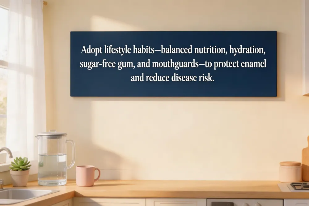 A balanced diet rich in fruits, vegetables, dairy, lean proteins, and whole grains supplies essential vitamins and minerals while limiting added sugars and acidic foods protects enamel from acid attack. Staying well‑hydrated and chewing sugar‑free gum stimulate saliva, which neutralizes acids and aids remineralization. Avoiding tobacco and excessive alcohol reduces gum disease, oral cancer, and delayed healing. Wearing a custom‑fit mouthguard during sports or a night guard for grinding safeguards teeth from trauma and wear, preserving long‑term oral health.
