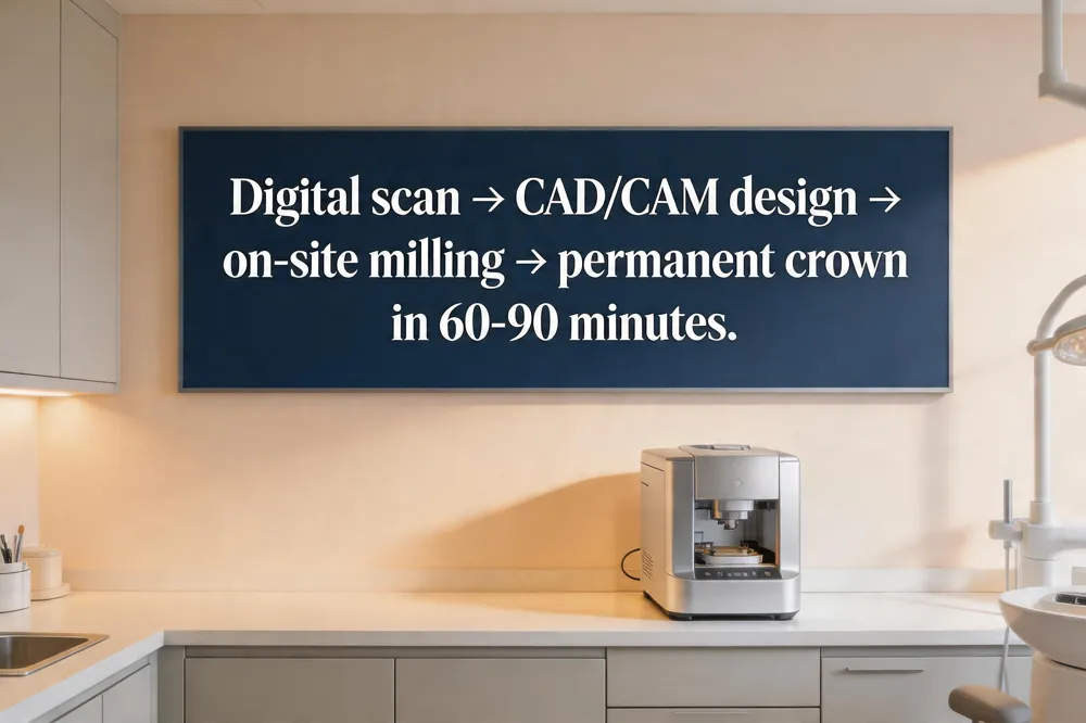Can a crown be made the same day? Yes—using chair‑side CAD/CAM (CEREC) technology, a permanent ceramic crown can be fabricated and placed in one appointment, usually 60‑90 minutes, eliminating a second visit.