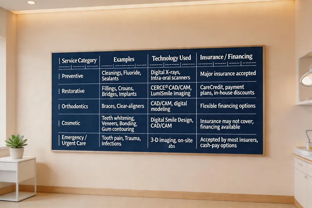 | Restorative | Fillings, Crowns, Bridges, Implants | CEREC® CAD/CAM, LumiSmile imaging | CareCredit, payment plans, in‑house discounts |