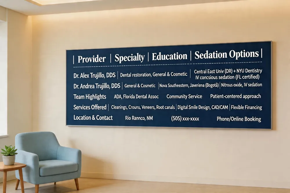 Dr. Alex Trujillo, DDS, earned his Doctor of Dentistry degree from the Central East University of the Dominican Republic and New York University College of Dentistry. Practicing privately since 2004, he specializes in dental restoration and is certified by the State of Florida in IV conscious sedation. Dr. Andrea Trujillo, also a general and cosmetic dentist, graduated from Nova Southeastern University and holds a doctorate from La Pontificia Universidad Javeriana in Bogotá, Colombia. Both are active members of the ADA, Florida Dental Association, and regional dental societies, and they regularly engage in community service. Their practice offers a full spectrum of services—from routine cleanings and crowns to porcelain veneers, bridges, and root canals—using advanced technology such as digital smile design, intra‑oral scanners, and CAD/CAM milling. A patient‑centered approach ensures comfort through options like nitrous oxide, IV sedation, and a calming office environment, making high‑quality, personalized dental care accessible for families in the Rio Rancho area.