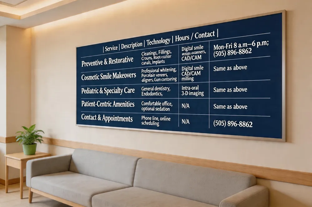 | Preventive & Restorative | Cleanings, Fillings, Crowns, Root canals, Implants | Digital smile design, intra‑oral scanners, CAD/CAM | Mon‑Fri 8 a.m.–6 p.m.; (505) 896‑8862 |