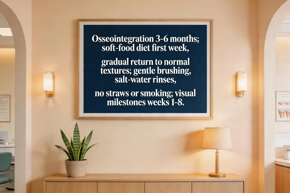 After implant placement, Osseointegration—bone fusing to titanium—takes 3‑6 months. During the first week follow a soft‑food diet (smoothies, yogurt, mashed potatoes) and progress to semi‑soft foods by week 2, then normal textures by weeks 3‑4 as swelling subsides.