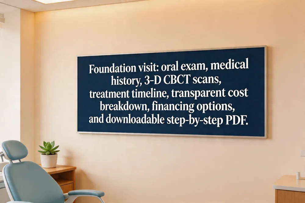 The first visit sets the foundation for a successful implant. A thorough oral exam and medical‑history review identify any gum disease, bone loss, or systemic conditions that could affect healing. 3‑D CBCT scans and panoramic X‑rays evaluate jawbone density, locate vital structures, and determine whether a bone graft or sinus lift is needed. Using this data the dentist creates a personalized treatment timeline, outlines each surgical and restorative phase, and provides a transparent cost breakdown—including the implant fixture, abutment, crown, and any adjunctive procedures. Financing options and a downloadable step‑by‑step PDF are offered for easy reference.