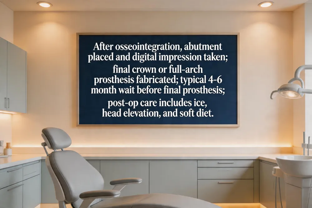 - Full‑mouth healing stages? Extraction/graft (if needed), implant placement, 2‑6 months osseointegration, abutment and final prosthesis placement.