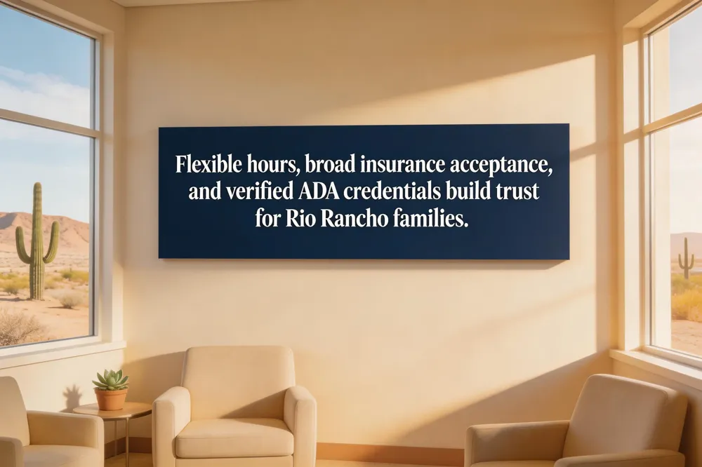 When Rio Rancho families look for a dentist, they prioritize location, office hours, and insurance compatibility. A practice that offers early‑morning, evening or weekend appointments fits school and work schedules, while an in‑network provider reduces out‑of‑pocket costs. Reputation matters too—recommendations from neighbors, online reviews highlighting clean, friendly staff, and ADA membership signal professionalism. Modern technology such as digital X‑rays, intra‑oral cameras, and laser treatments improves diagnostic accuracy and patient comfort, and a full range of services—from pediatric sealants to adult implants—lets families stay with one provider as needs evolve.