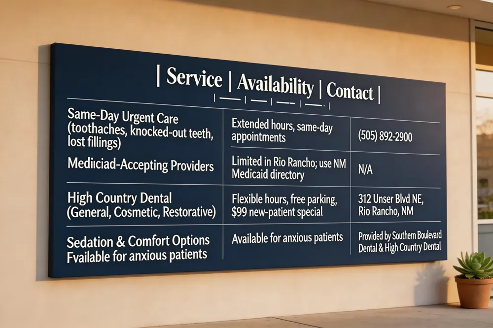 When a dental crisis strikes in Rio Rancho, prompt attention is essential. Southern Boulevard Dental provides same‑day appointments and extended hours for urgent issues such as severe toothaches, knocked‑out or chipped teeth, lost fillings, and infections. Call (505) 892‑2900 for immediate assistance and receive compassionate, technology‑driven care in a comfortable, patient‑centered setting.